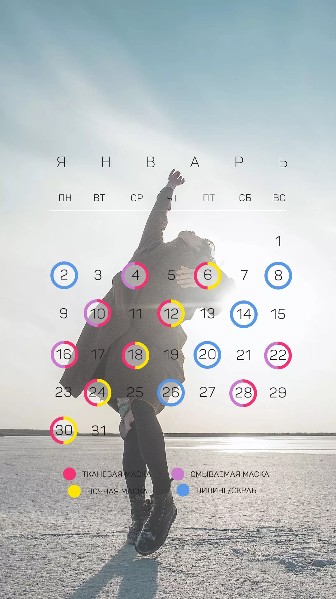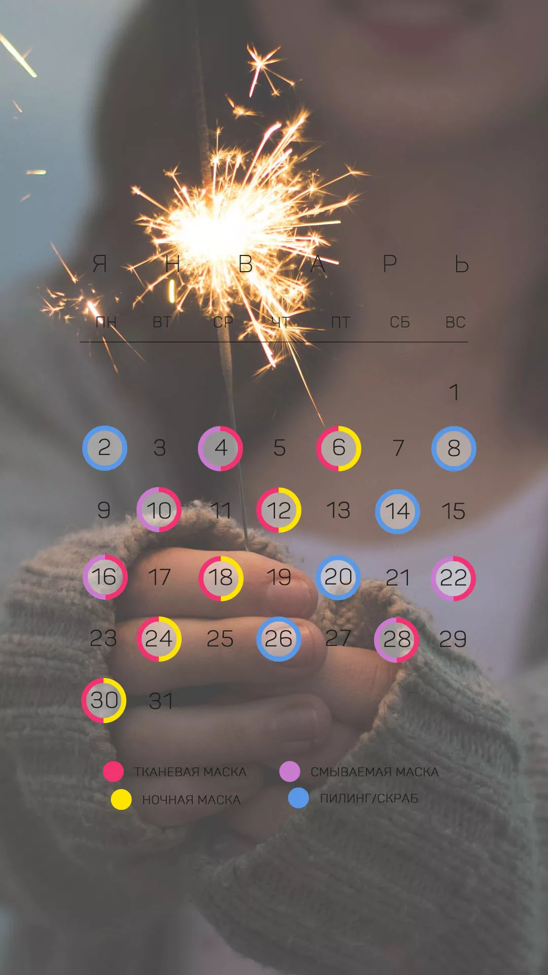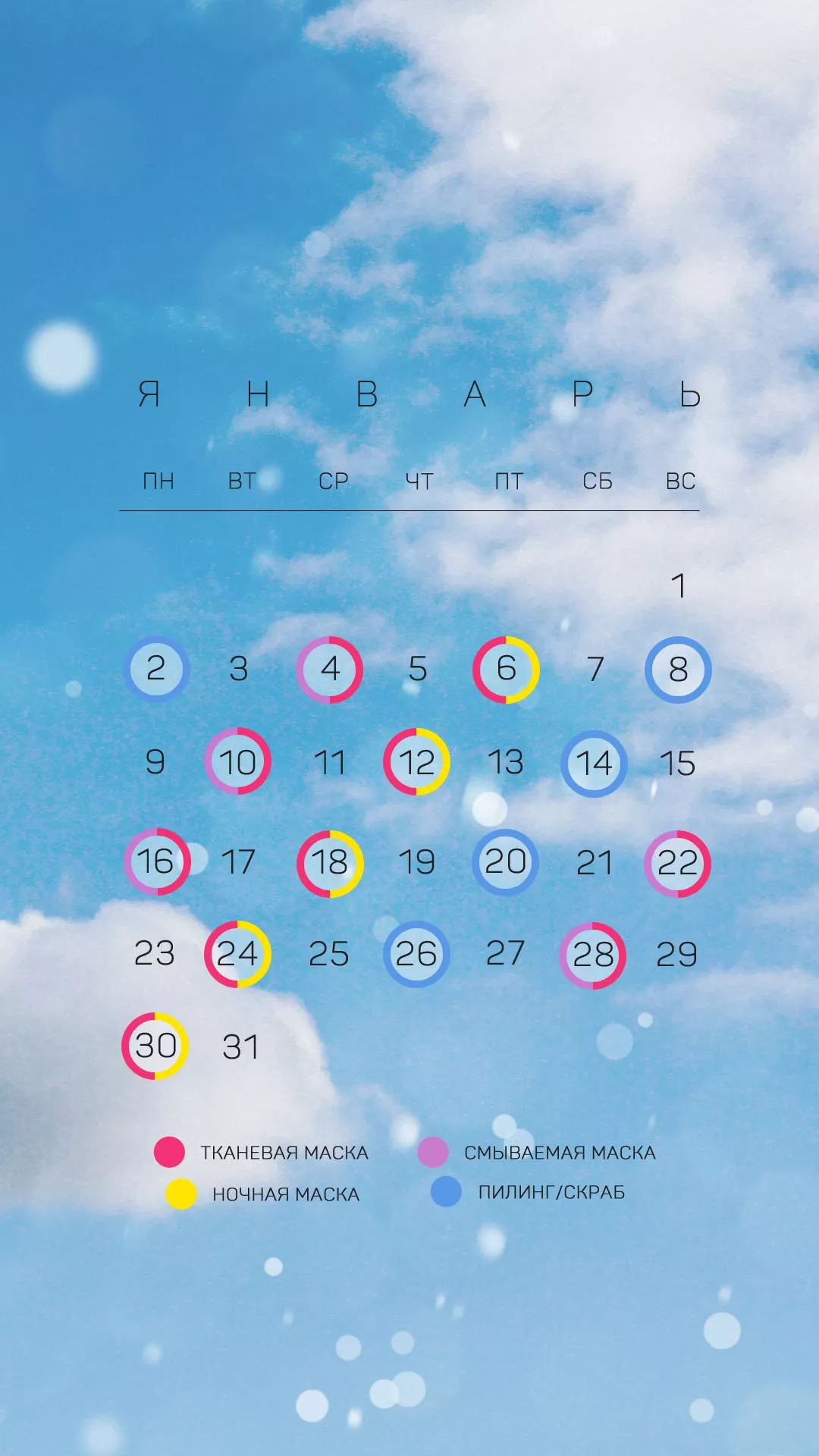Напомним, как ими пользоваться. В первом календарике — базовая, во втором — расширенная программа ухода. Утром и вечером очищайте, тонизируйте и увлажняйте кожу, а несколько раз в неделю используйте маски и пилинги или скрабы: