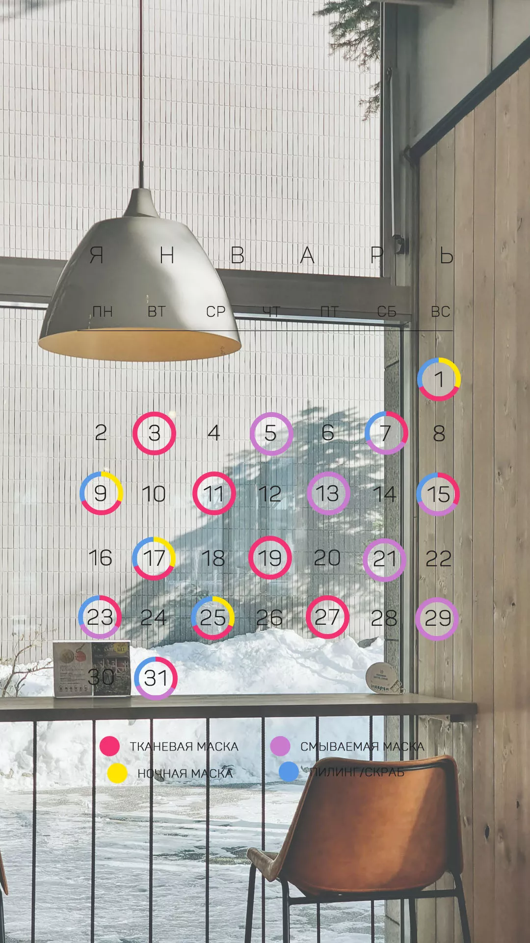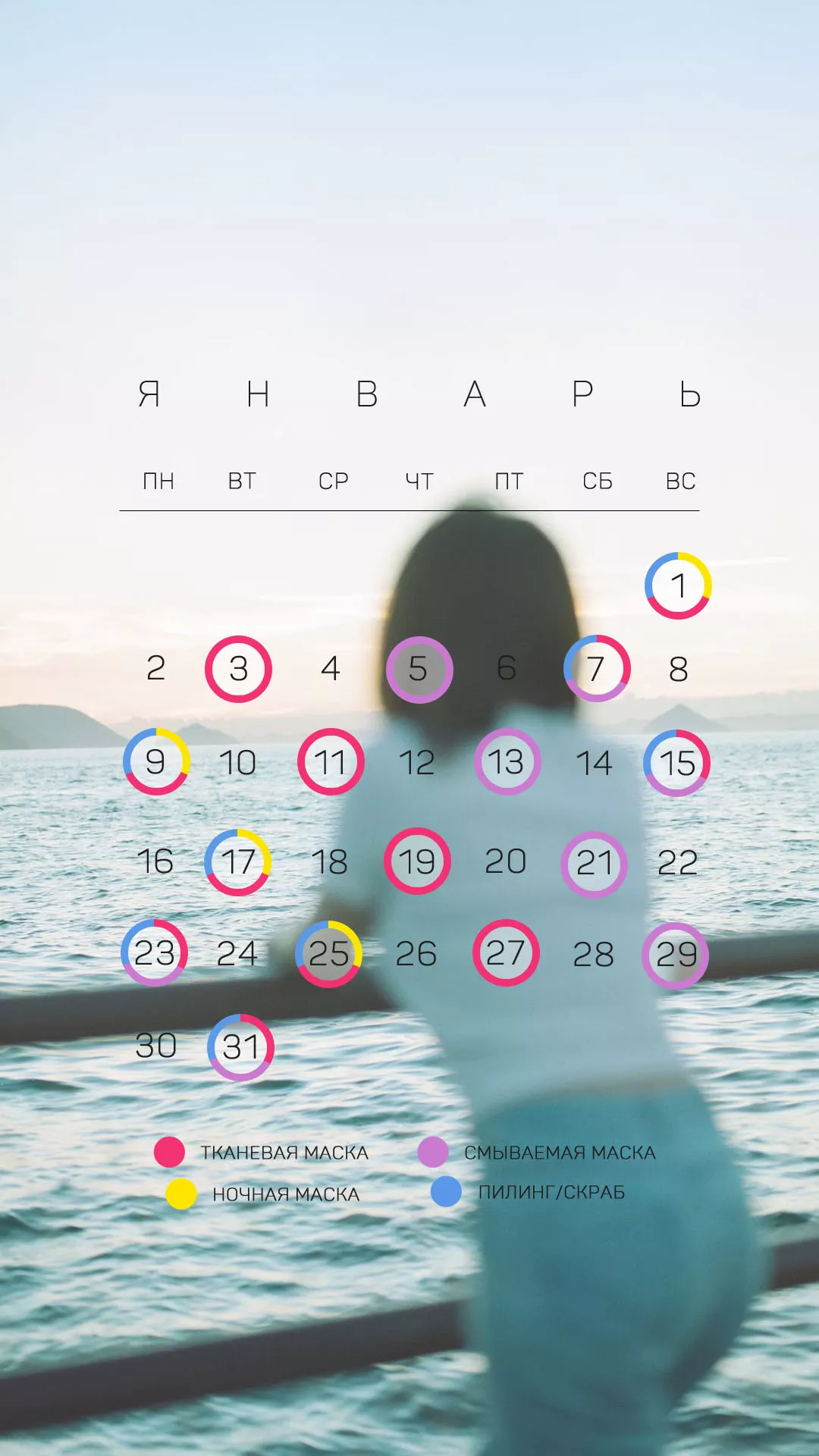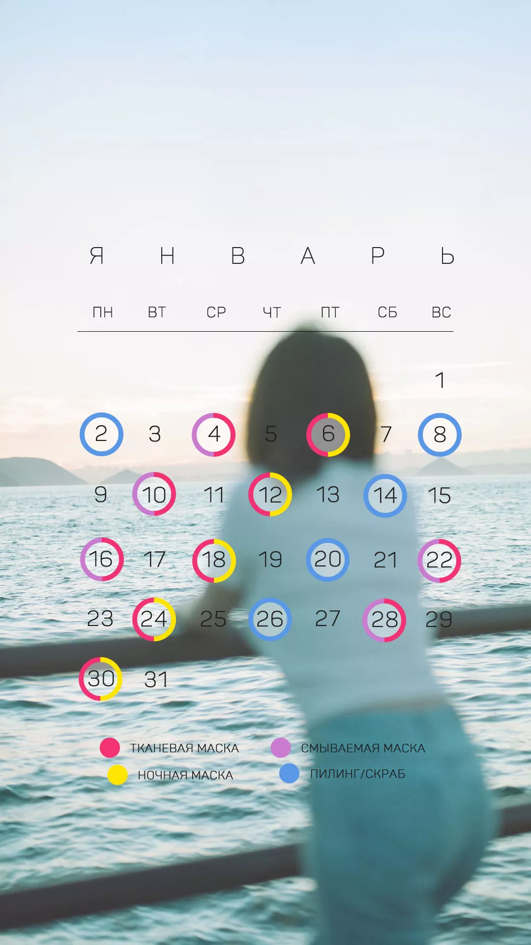 Напомним, как ими пользоваться. В первом календарике — базовая, во втором — расширенная программа ухода. Утром и вечером очищайте, тонизируйте и увлажняйте кожу, а несколько раз в неделю используйте маски и пилинги или скрабы: